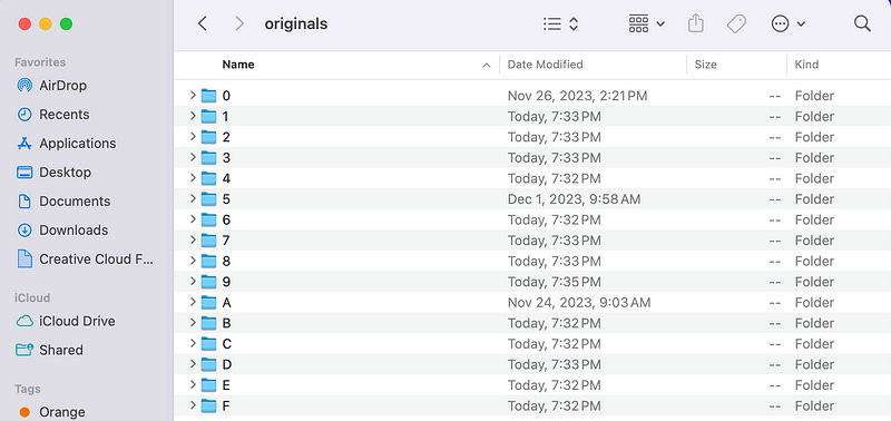 Here, you’ll see a bunch of folders named 0 through 9 and A through F. Inside those directories, are the original files for your photos and videos! Photos and videos will be distributed across these directories.