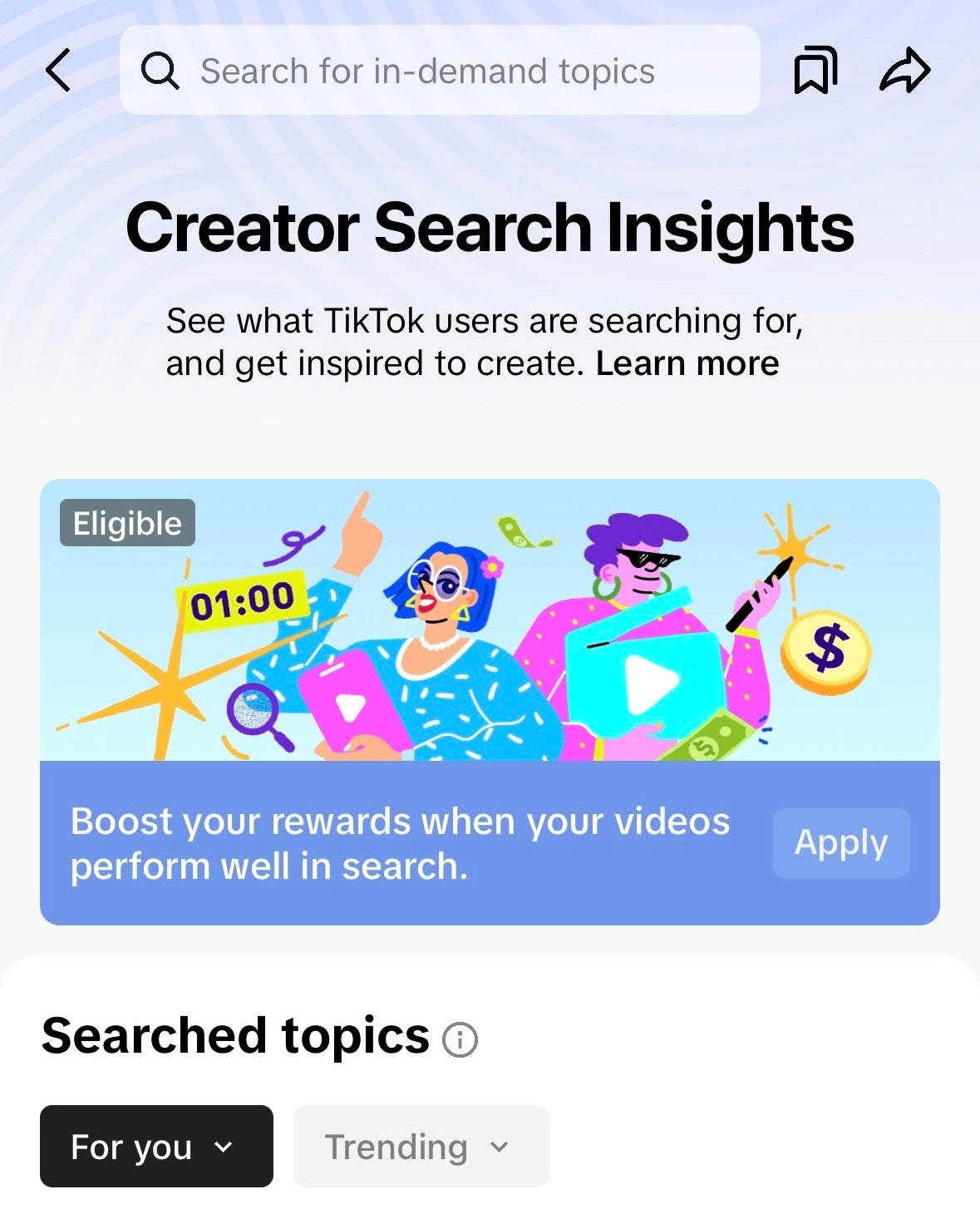 To help creators, TikTok introduced a tool called Creator Search Insights to find trending topics.