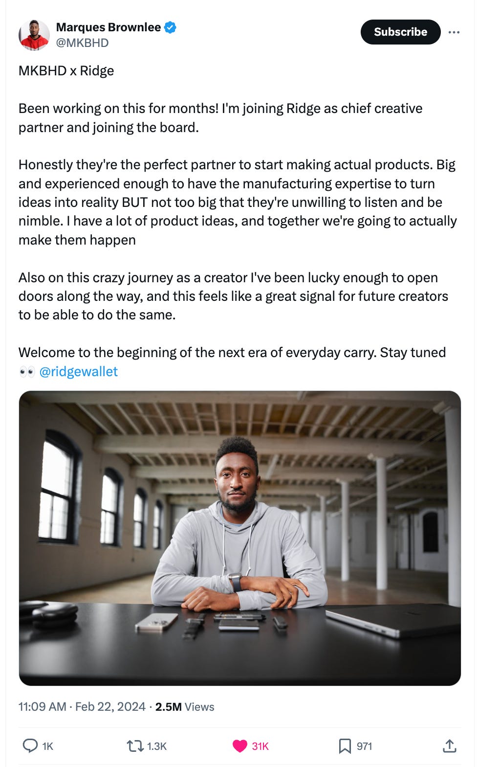 Now, Ridge is partnering directly with creator Marques Brownlee as the brand’s chief creative partner, member of the board, and investor.1