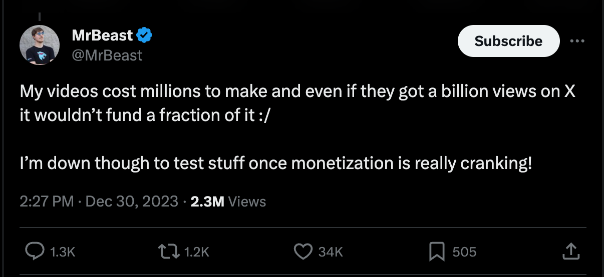 Take MrBeast for example - he is the largest Youtube creator in the world and reportedly earned $54M from his main channel in 2023.