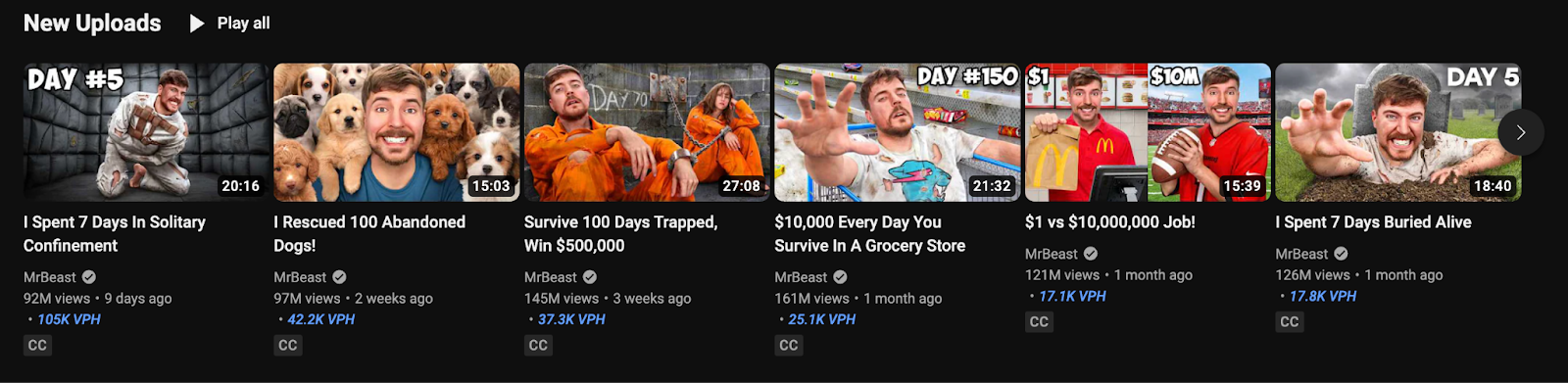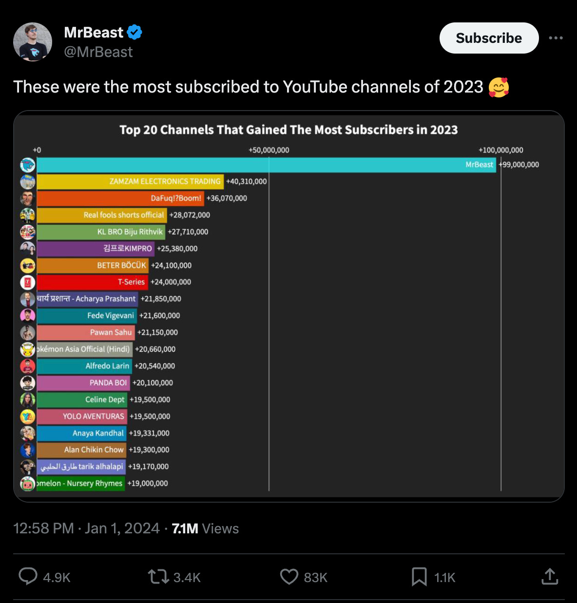 For comparison, ~40M people saw Barbie in theaters last year. That is less than half of the views for MrBeast’s weekly videos.